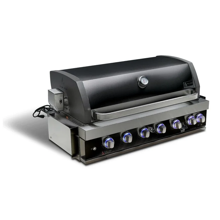 Built-in grills are designed for permanent installation in your outdoor living space or countertop, featuring high-quality stainless steel construction and powerful burners with precise temperature control for consistent results. Both the four and six-burner built-in models include ceramic infrared rear burners and durable 304 stainless steel components. Each grill is ready to use upon installation and comes equipped with a rotisserie kit featuring an electric motor, a convenient bottle opener, a weather cover, two halogen cooking surface lights, LED control knob lights that change color (red/blue), and electronic ignition, ensuring effortless meal preparation for your family.
